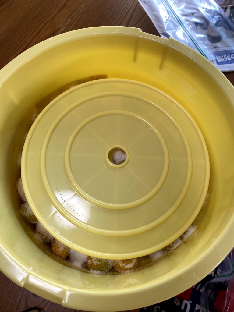 全部入れたら中蓋をして重石をのせます。重石は漬けた梅の2倍の重さが理想です。