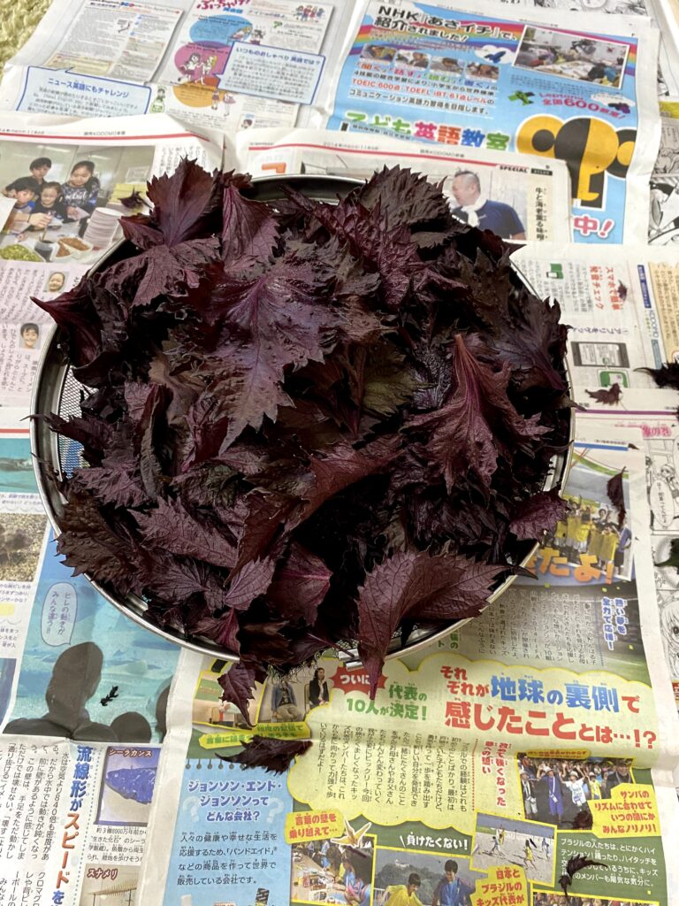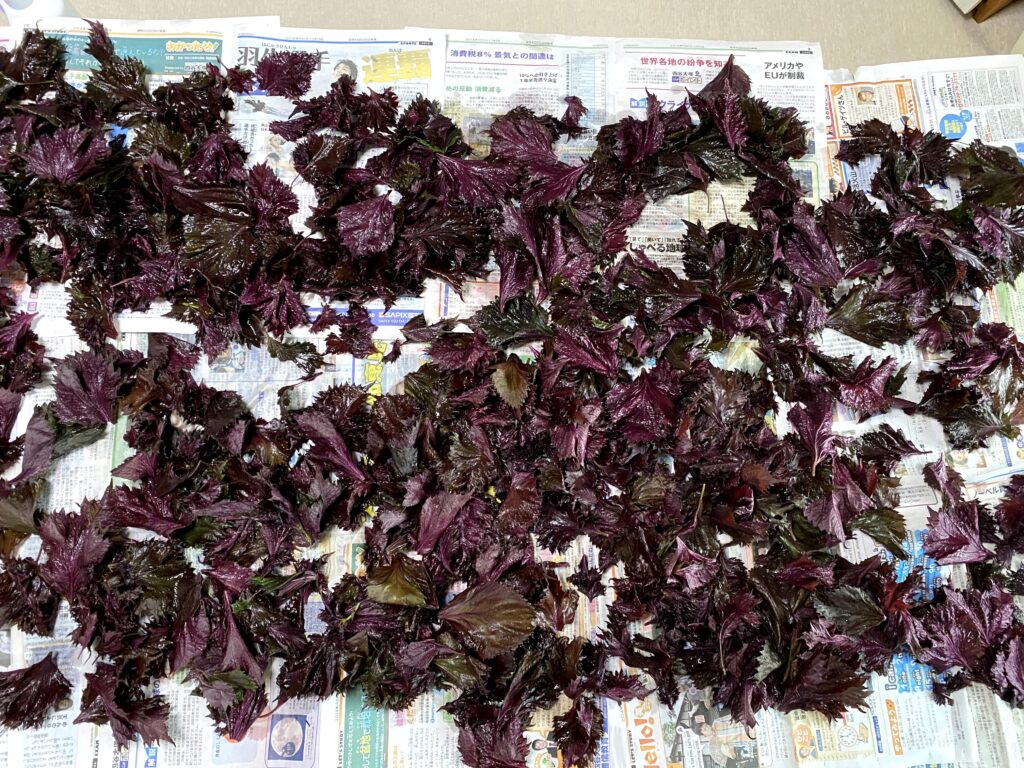 大きい葉っぱを中心に一枚ずつ摘みます。できるだけ大きくて両面がきれいな紫紅色の葉を選びましょう。