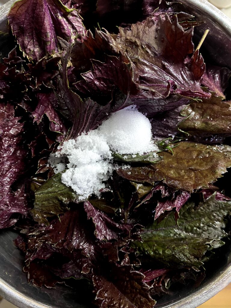 塩を赤紫蘇になじませながら押すように揉んでいきます。