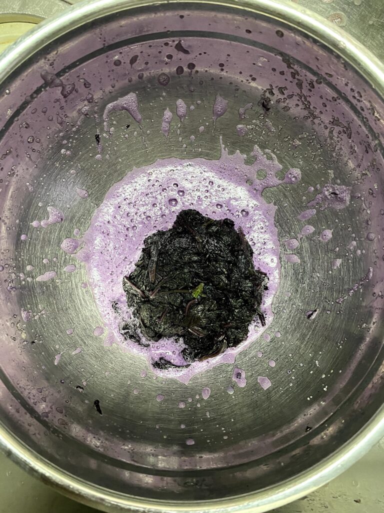さらに揉んでいくとアクの汁(濁った紫色の汁)が出てきます。