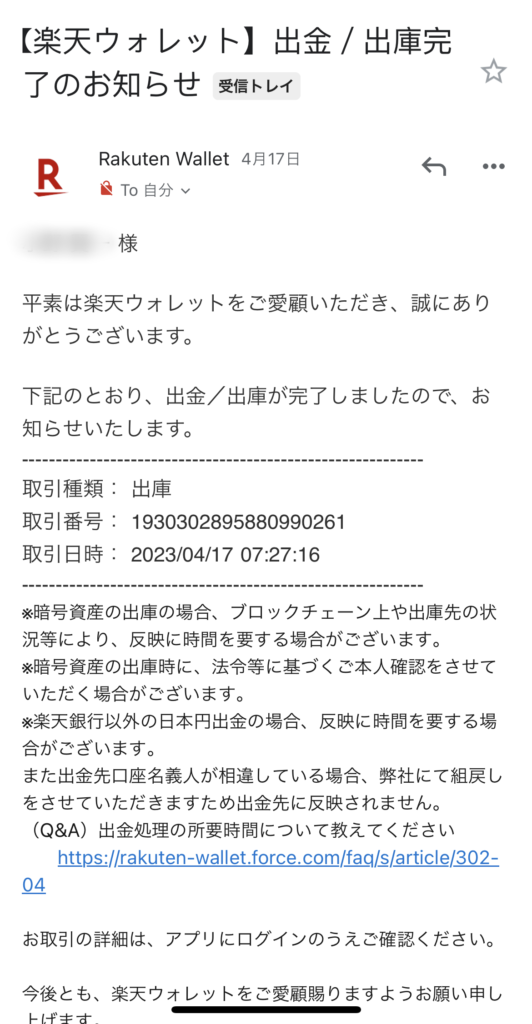 楽天Walletから出庫完了メール、Bitflyerからお預入れの連絡がきたら移動完了です。