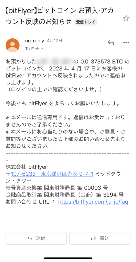 翌日、楽天WalletからとBitflyerから以下のメールが届きます。